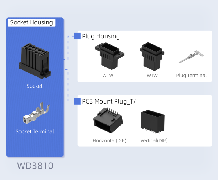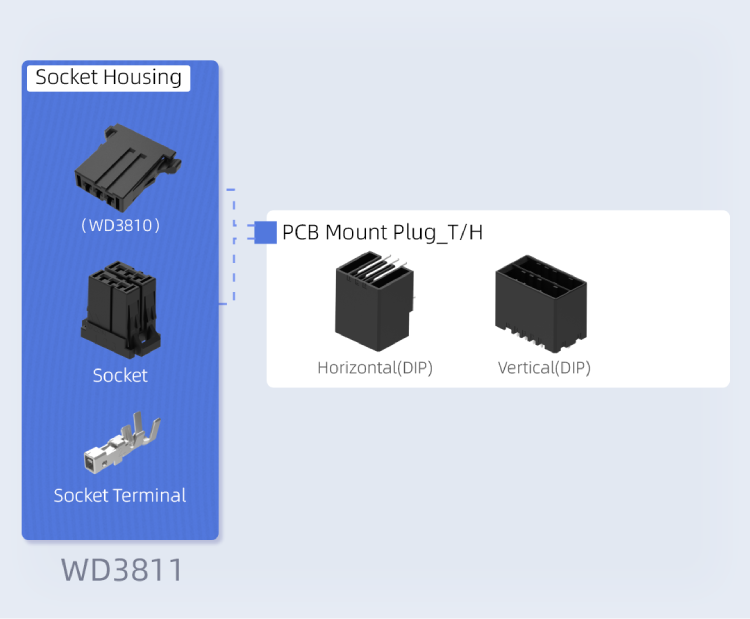 WD3810 和 WD3811 系列是线对板和线对线欧亿在线(中国)器。这些欧亿在线(中国)器具有紧凑的 3.81 mm 间距,提供垂直和水平电缆出口方向,旨在适应高密度 PCB 布局,促进设备小型化。